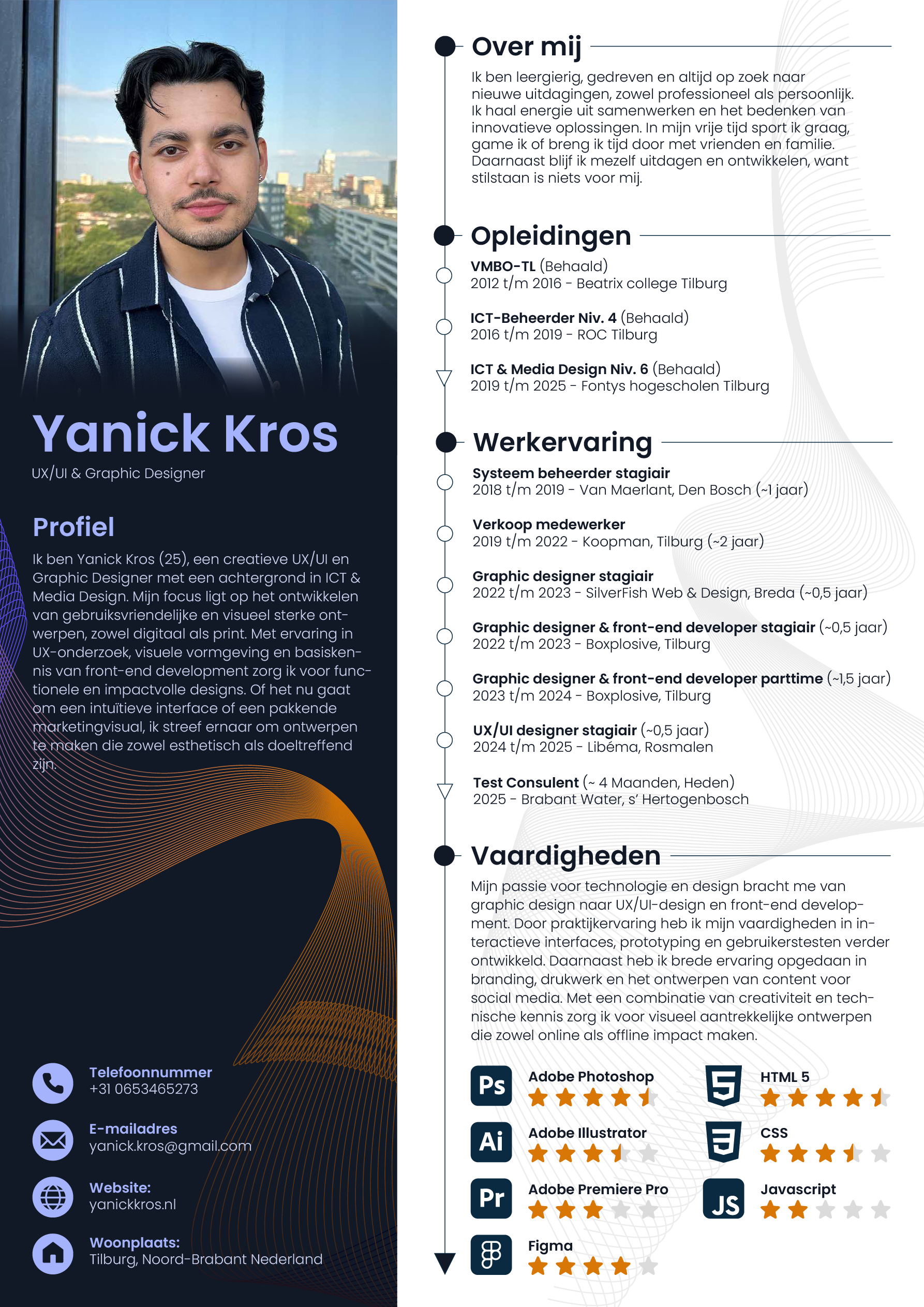 Ik ben Yanick Kros, 25 jaar, UX/UI & Graphic Designer met een passie voor sterke visuele communicatie en gebruiksvriendelijke digitale ontwerpen. Met een achtergrond in ICT & Media Design combineer ik creativiteit en technische kennis om designs te maken die zowel mooi als functioneel zijn – van branding en print tot apps en social media.